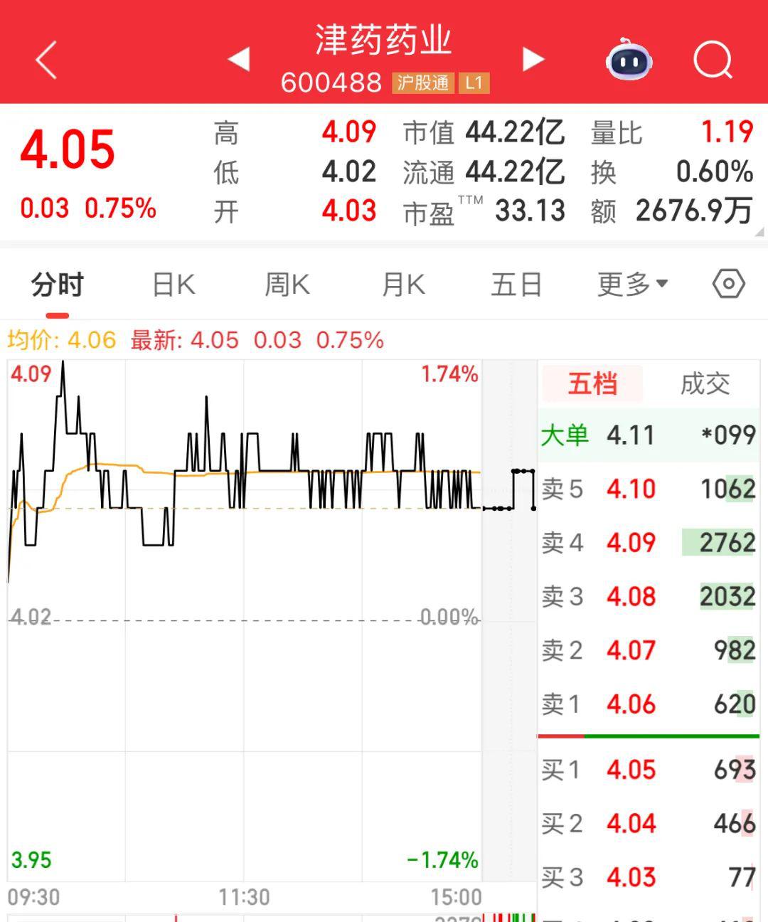 截至4月30日收盘,津药药业涨0.75%,股价报收4.05元,公司总市值为44.22亿元。