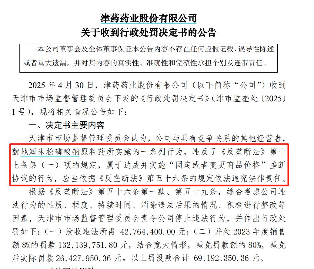 津药药业表示,天津市市场监督管理委员会认为,公司与具有竞争关系的其他经营者,就地塞米松磷酸钠原料药所实施的一系列行为,违反了《反垄断法》第十七条第(一)项的规定,属于达成并实施“固定或者变更商品价格”垄断协议的行为,应当依据《反垄断法》第五十六条的规定依法追究法律责任。